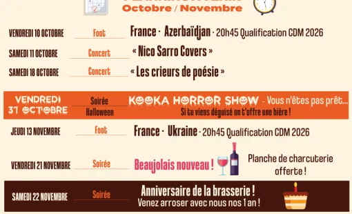 🍻 Planning à venir – Octobre & Novembre à la Brasserie Kooka ! 🎉
